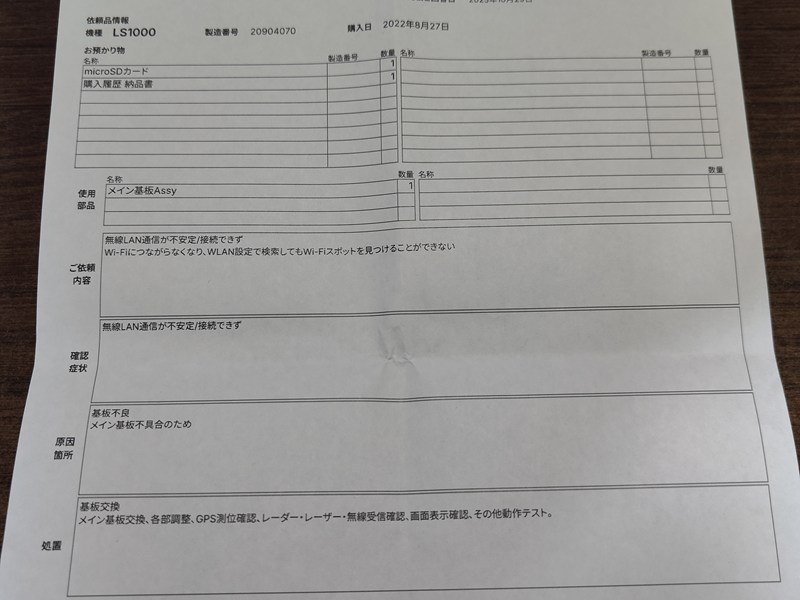 ユピテルのレーザー探知機 LS1000が壊れたので修理に出しました。